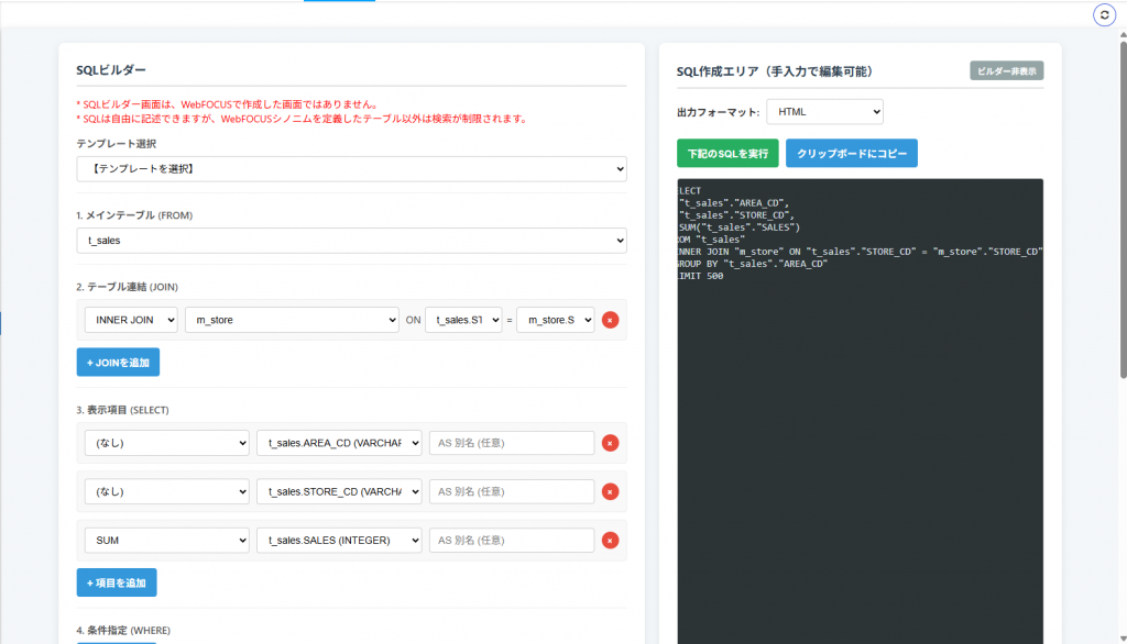 手入力でSQL文を記載してレポートを実行できるため、自由にSQLを発行できるため自由度が高いのが特徴です。