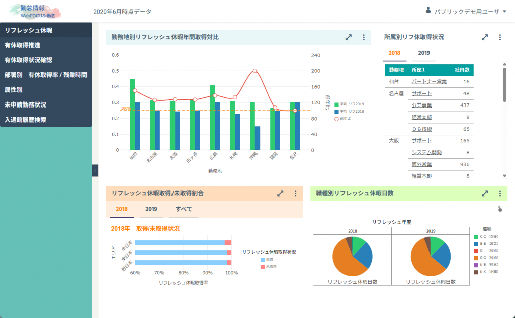 従業員の勤務状況や残業時間、休暇取得状況など、勤怠システムのデータを様々な視点からデータを可視化しています。