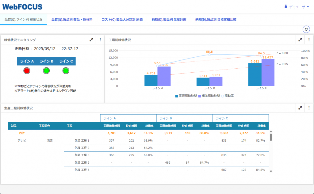 稼働状況、原価、納期などの生産管理のデータをグラフや表で表現し、インタラクティブな操作で詳細を確認することができます。