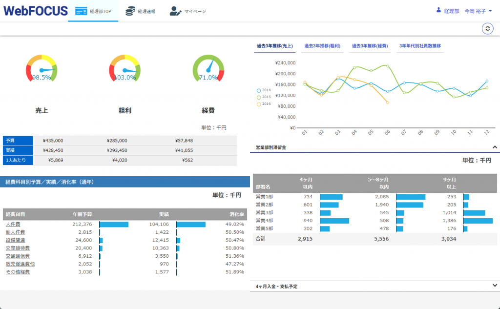 ログインする利用者の立場(経営層、営業部、経理部など)や業務内容によって表示される情報や使える機能が切り替わる「ポータル」のサンプルです。利用者の立場や業務内容に応じて、必要とする情報や機能が最適化された形で提供されるのが、このデモの大きな特長です。