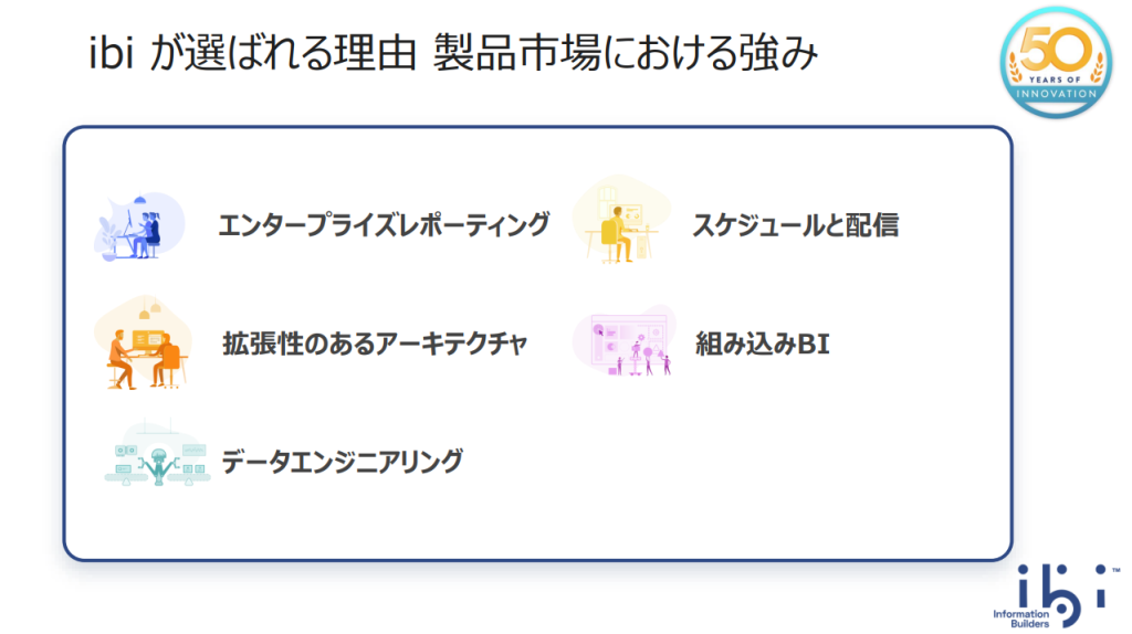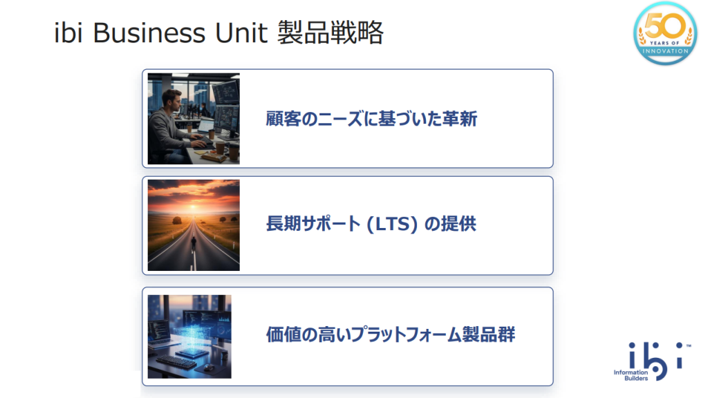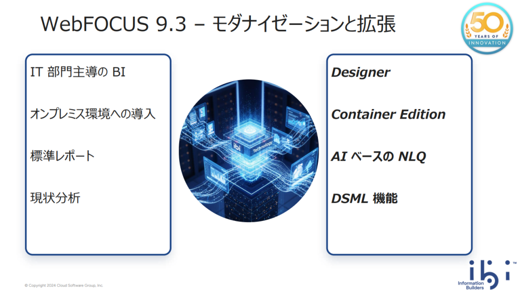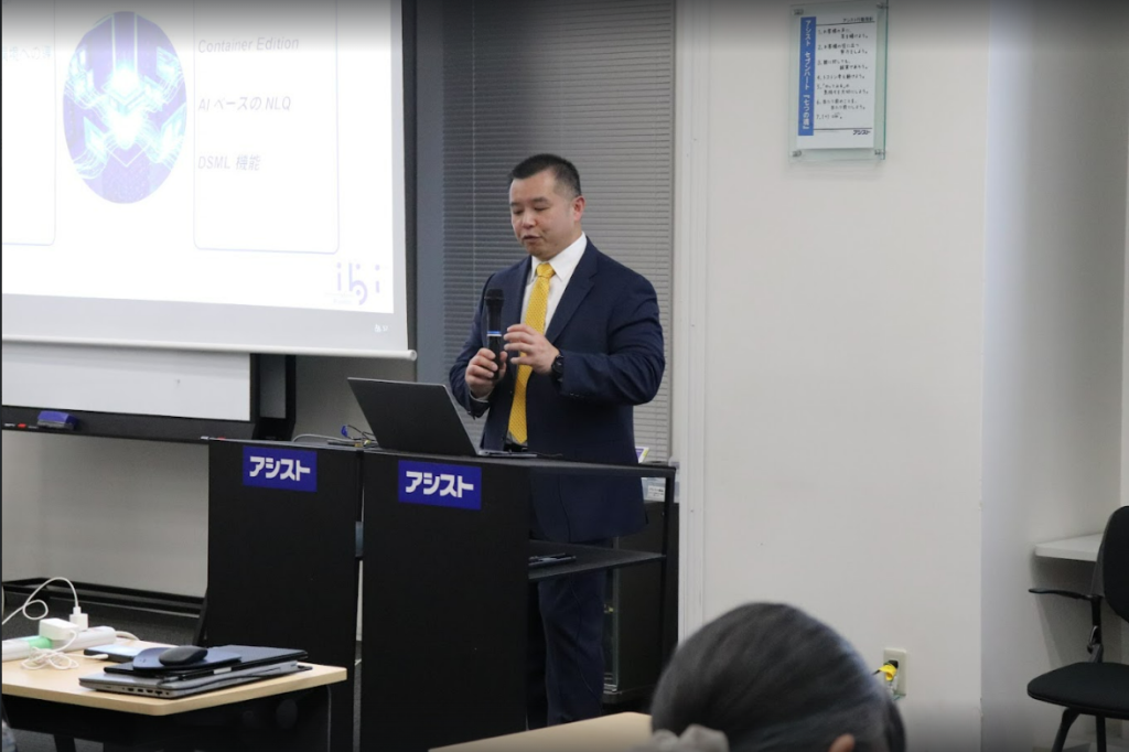 WebFOCUSのロードマップと今後の方針について、5つのキーテーマ(Designer、Container Edition、AIベースのNLQ、DSML機能、エンタープライズレポーティング)ごとにメーカー担当者からご説明させていただきました。